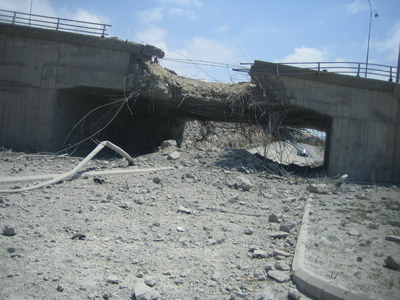 شاهدنا في طريقنا لبيروت وعندما اقتربنا من " جبال حالات " جسرها الذي استهدفته الطائرات الحربية عدة مرات وساوت به الأرض نظراً لأهميته بارتباطه ببيروت وبالخط الدولي. وقال الأهالي بأن تعميره يحتاج لثلاث سنوات. لفت نظرنا تكرار لافتات كبيرة معروضة على جانبي الطريق وبكثافة تقول: 68 – 78 – 86 – 93 – 96 ياللي عمر مرة بيعمر كل مرة. تأكيداً على إصرار اللبنانيين على تعمير ما خربه العدو الصهيوني في حروبه للأعوام المتتالية. اقتربنا من جونيه البلدة المسيحية الجميلة وقد دمر "جسر أدما " وهو يقع قرب محطة LBC. أما المدينة نفسها جونيه – وبكركي فلا علاقة لها بالحرب حيث تعيش حياتها اليومية المعتادة. إلا أن الأشرفية في بيروت التي تعرضت لقصف طائرات العدو وهي مركز لتيار العماد ميشيل عون وبها أغلبية مسيحية فقد احتضنت هذه الضاحية مجاميع كبيرة من نازحي الضاحية الجنوبية ومثلت وحدة لبنان التي أراد العدو استهدافها.