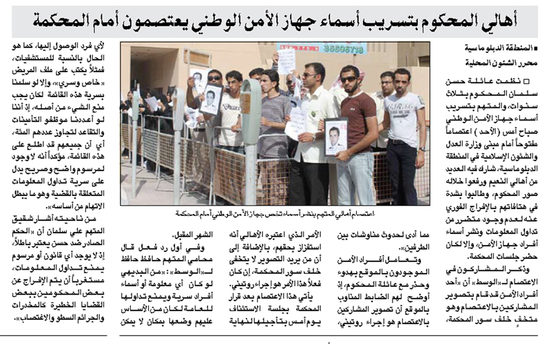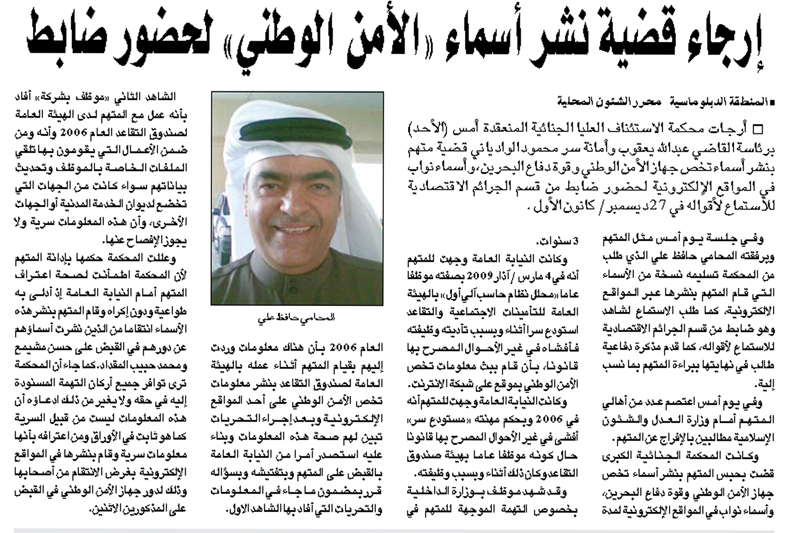 أرجأت محكمة الاستئناف العليا النظر في قضية متهم قام بنشر أسماء تخص جهاز الأمن الوطني وقوة دفاع البحرين وأسماء نواب في المواقع الإلكترونية إلى تاريخ 27 ديسمبر المقبل لطلب التصريح بنسخة من القائمة التي نشرت وطلب أحد شهود الإثبات. وكانت محكمة الدرجة الأولى قد قضت بحبس المتهم لمدة 3 سنوات، بعد أن وجهت إليه النيابة العامة أنه وبصفته موظف عام "محلل نظام حاسب آلي أول بالهيئة العامة للتأمين الاجتماعي" استودع سرا أثناء وبسبب تأديته وظيفته فأفشاه في غير الأحوال المصرح بها قانونا، بأن قام ببث أسماء العاملين بجهاز الأمن الوطني بموقع على الانترنت. وتعود تفاصيل الواقعة إلى أن ورود معلومات إلى أحد الموظفين بوزارة الداخلية تشير إلى قيام المتهم أثناء عمله بالهيئة بنسخ أسماء وأعضاء جهاز الأمن الوطني وصفها في أحد المواقع الالكترونية. وبعد إجراء التحريات تبينت صحة المعلومات وبناء عليها تم استصدار إذن من النيابة العامة بالقبض على المتهم، وبتفتيشه وسؤاله قرر بمضمون ما جاء بالمعلومات والتحريات التي أفاد بها الشاهد الأول. وأفاد الشاهد الأول بأنه قد وردت إليه معلومات بقيام المتهم أثناء عمله بالهيئة بنسخ أسماء وأعضاء جهاز الأمن الوطني وقوة دفاع البحرين ومجلس النواب وصفها في احد المواقع الالكترونية، وفي منزل المتهم تم ضبط جهاز حاسوب وعدد من الأقراص المدمجة.