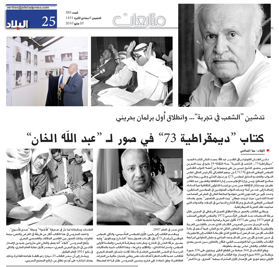 دشن الفنان الفوتوغرافي القدير عبد الله محمد الخان كتابه الجديد "ديمقراطية 73...الشعب في تجربة" مساء الثلاثاء 18 مايو في بيت البحرين للتصوير بحضور الشيخ عيسى بن علي ومجموعة من أعضاء النواب القدامى للمجلس الوطني السابق (73 إلى 75 ) من بينهم الظهراني الرئيس الحالي للمجلس ورسول الجشي وعلي ربيعة وعلي صالح الصالح , ويحكي الكتاب بالصور مرحلة انطلاق العمل البرلماني في البحرين خلال السبعينيات منذ المجلس التأسيسي 1972م كأول تجربة برلمانية تشهدها البلاد ,واعد الكتاب الزميل حسين المحروس  الذي صدر بالغتين العربية والإنجليزية بشكل كامل وهو التعاون الثاني له مع الخان